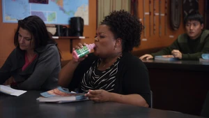 The Dean returns and announces that the world food festival has turned into a “race kerfuffle” in the parking lot, leaving Shirley stuck on campus as even ambulances are unable to get through. Abed reveals a surprising aptitude and knowledge regarding child delivery and takes charge of the situation. However, when he moves to check the progress of the baby Shirley refuses to let him see her "nethers." Eager to prove she is up to the task, Britta peeks under Shirley's skirt but is again unable to deal with the perfectly natural process and vomits into a trashcan.