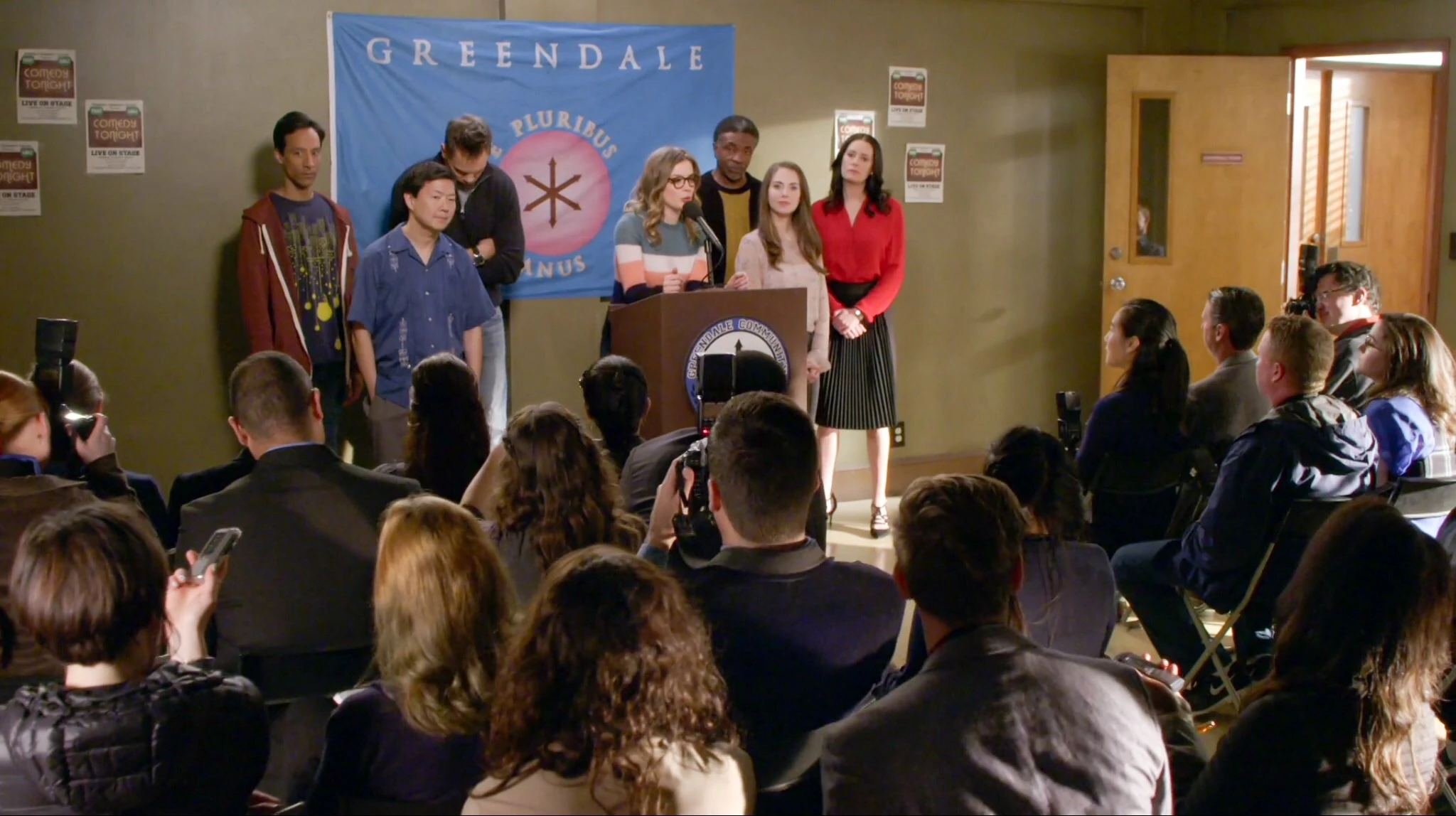 | When Gupta begins his set, Dean Pelton gets a text from the hacker threatening to make every Greendale student's emails public. Neil rushes the stage to stop Gupta but is restrained by Elroy and Jeff. Neil warns that, although his attempt to stop the show was thwarted, the committee cannot prevent "the people" from doing the same. At that moment, a mob of Greendale students stampedes toward the cafeteria to stop Gupta's performance. Britta orders Chang and Frankie to block the doors and Gupta to continue his routine. The comedian reluctantly obliges as the mob of angry students continues attempting to break through the doors. After Gupta makes a few poorly delivered and very offensive jokes based on fat people, Jewish and black people, Dean Pelton receives news that the hacker has followed through on his threat. The mob breaks down as the students argue with each other over the newly released emails. Meanwhile, Gupta continues his offensive act.