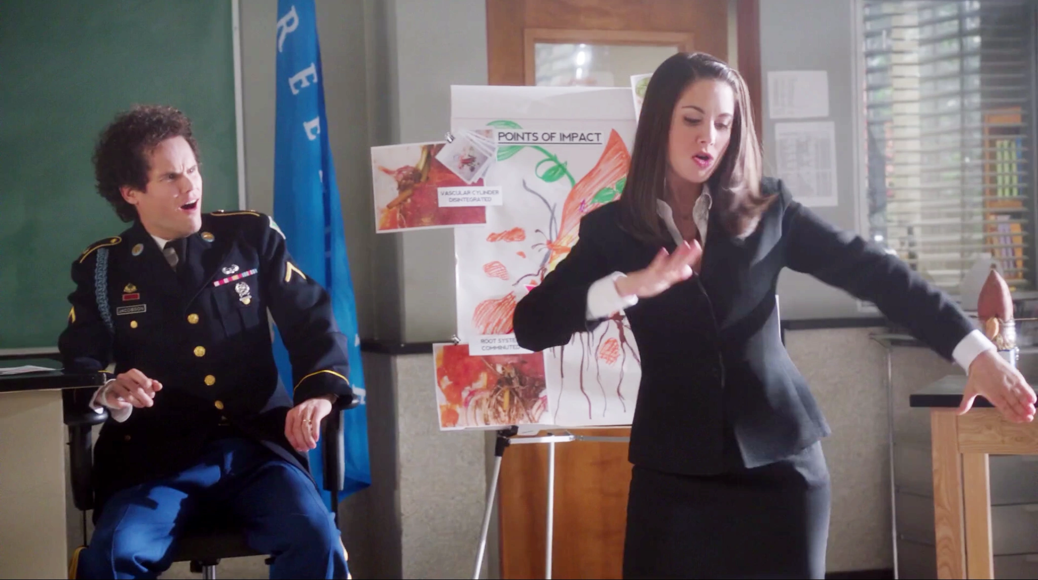 | Star-Burns agrees to name the real suspect as long as his pilfering of the biology lab is kept secret. He makes Troy and Abed pinky swear on it and then tells them it was Todd. Troy and Abed apprehend the suspect at his basket weaving class. He is brought to the biology classroom before Professor Kane where Jeff and Annie present their case against him. Before Todd can respond to the charges, they are interrupted by the dramatic appearance of his former CO Lieutenant Colonel Archwood. He states his credentials as an attorney and demands to know why his client is being harassed. To resolve the situation, the entire matter is brought before Dean Pelton in his office.