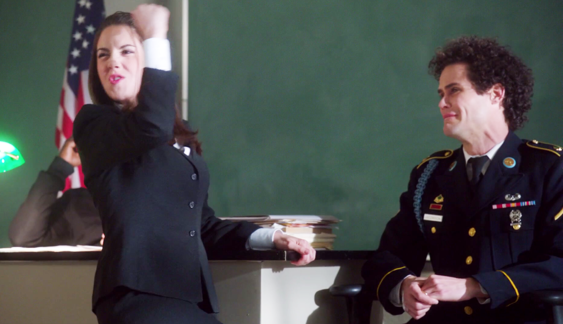 They inform them that Archwood threatened Star-Burns, and now their only witness has disappeared. A determined Annie still plans on trying the case despite Jeff's objections. The next day, Archwood is doing his best to portray Todd as a national hero at the trial. When it's Annie's turn to cross examine him, she uses the very virtues Archwood was extolling about Todd against him. She manipulates him by calling on his sense of duty and honor to come clean. He begins to crack under the pressure of her pleas and lets it slip that what happened was an accident. He dropped the yam because it was hot and burned his hand. The class is stunned by his admission as Annie performs a victory dance. |