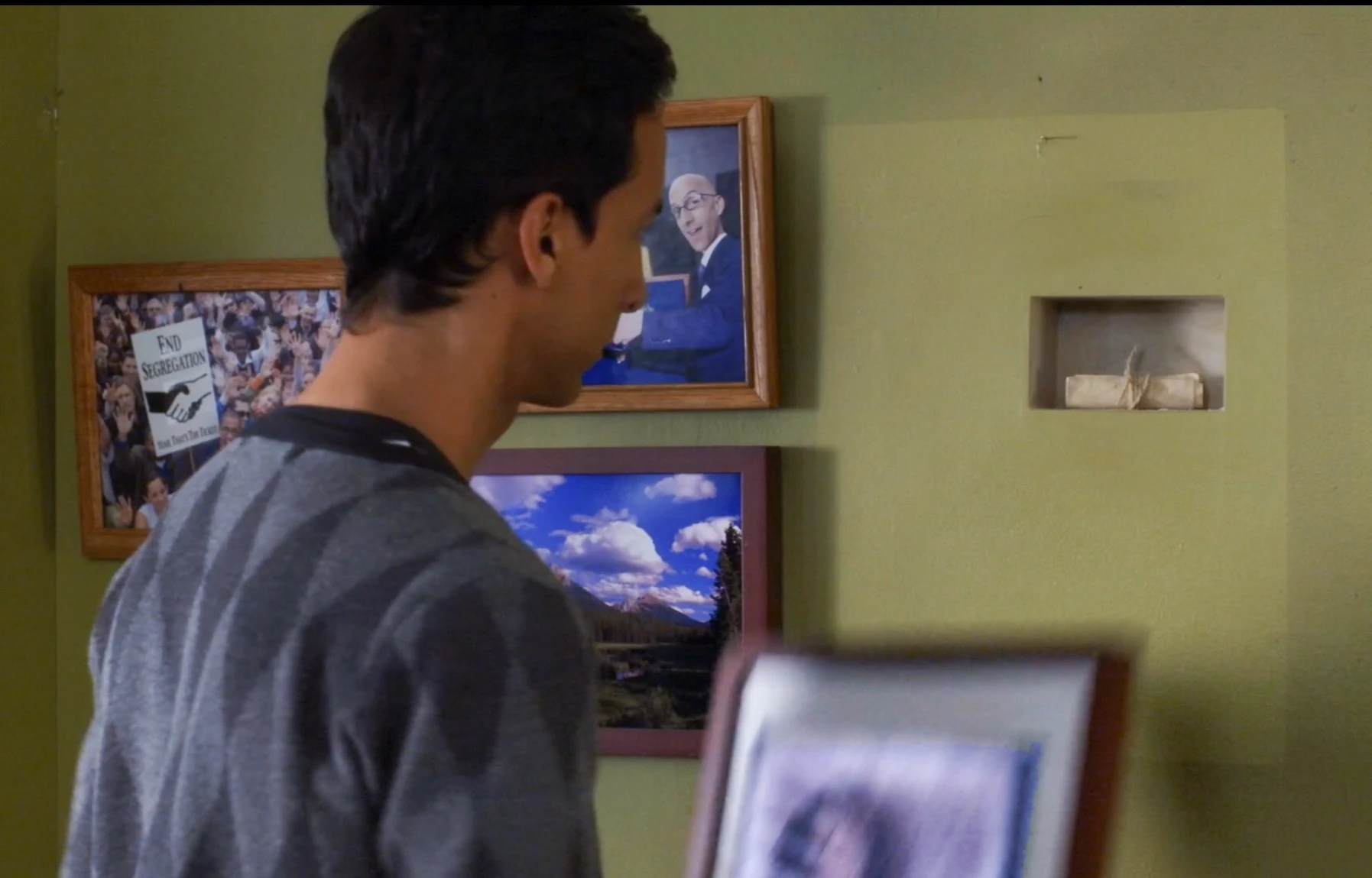 After trying to avoid being in a story, Abed turns around and looks straight into the camera as if reacting to having seen it.