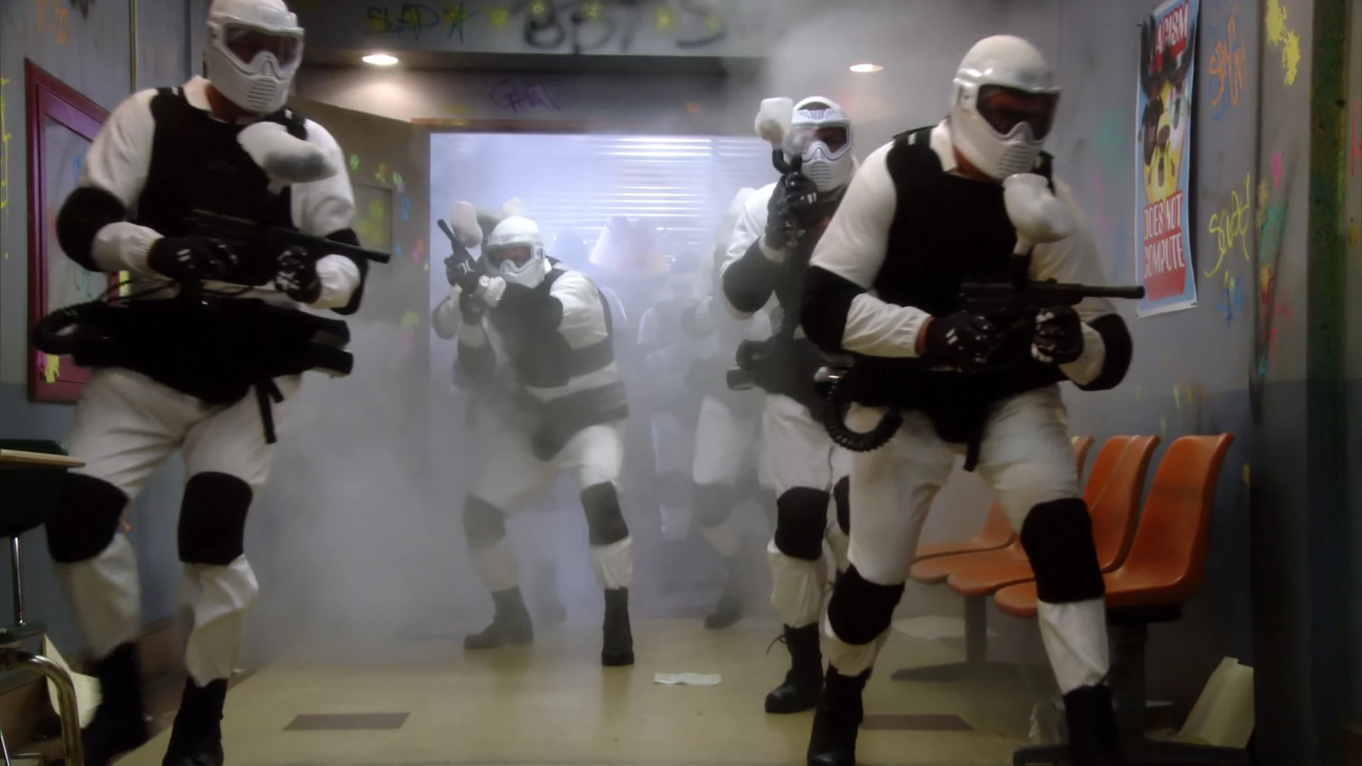The City College Storm Troopers all outfitted with the same white jumpsuit, white knit skull caps, black combat boots and equipped with the same paintball paraphernalia. Unlike the Greendale students, they also have paintball protection gear including goggles, tactical vests, front harnesses as well as elbow and knee pads. They also use a comm system and are in constant contact with Dean Spreck to carry out his orders. The handheld weapons they use seem to be the Empire ER3 Marker model with paintball loaders attached. Other equipment they use include a gatling gun and remote controlled cars equipped with various payloads such as a grenade.