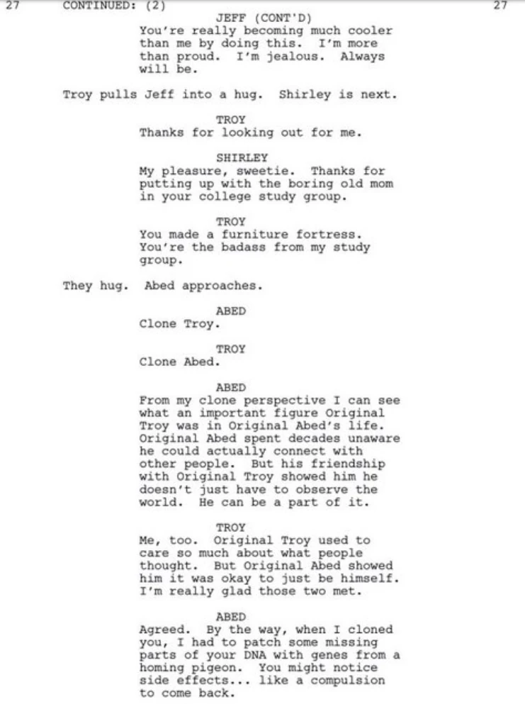 Abed: From a clone perspective I can see what an important figure Original Troy was in Original Abed's life. Original Abed spent decades unaware he could connect with other people. But his friendship with Original Troy showed him he doesn't just have to observe the world. He can be a part of it.