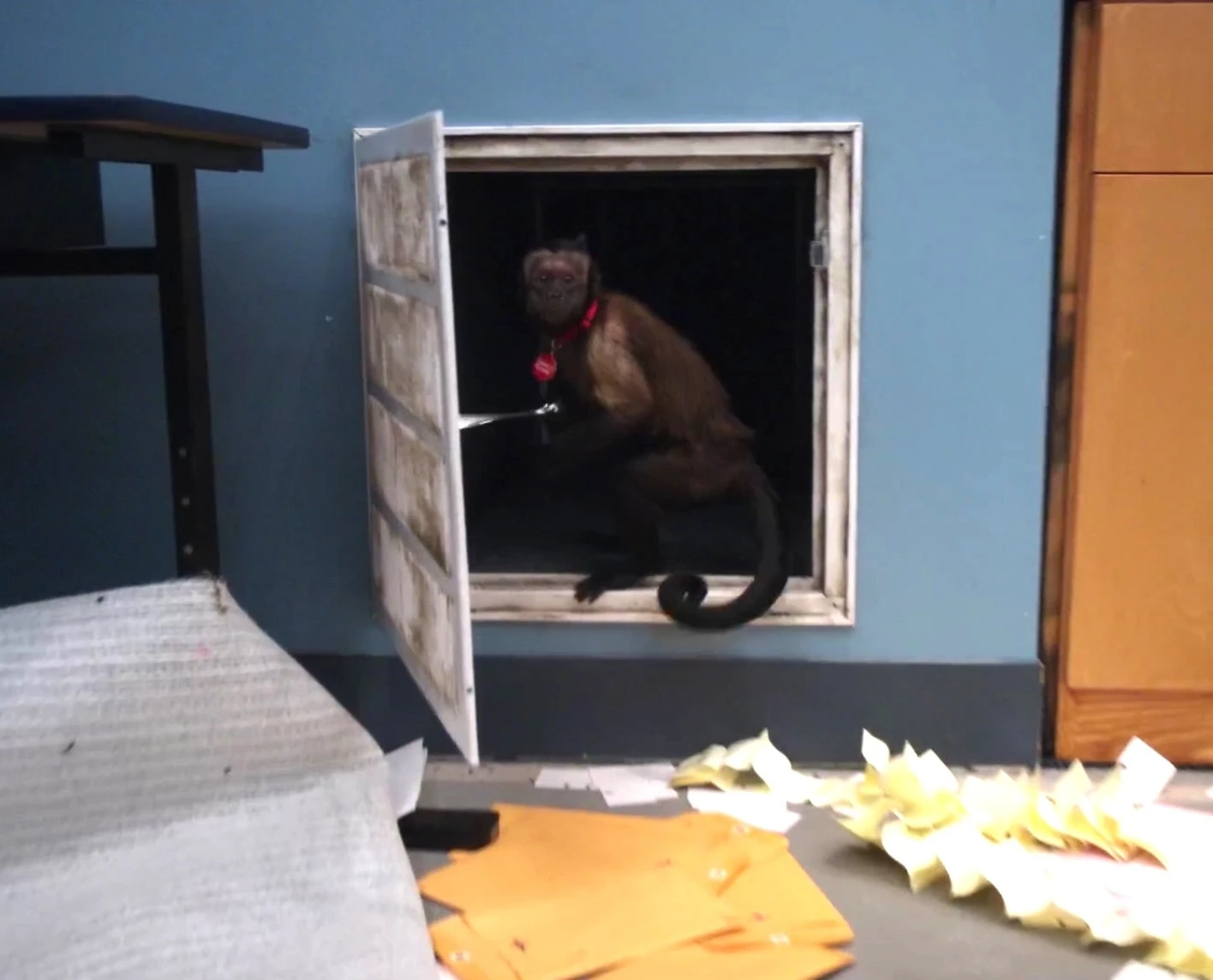 | In the study group's second year at Greendale, Annie's pen went missing in the study room. A frantic search failed to turn it up and the group was forced to accept Troy's theory that a ghost took it. Unbeknownst to them, Annie's Boobs was responsible. After being set free by Abed back in their freshmen year, the monkey took up residence inside Greendale's ventilation system. He began hoarding personal paraphernalia of the study group including Annie's pens deep inside the air vents ("Cooperative Calligraphy"). This wasn't discovered until later in the semester when Troy spotted Annie's Boobs escaping into an air vent with a paintbrush he was using for the group's latest diorama. Ben Chang went after him and located the stolen goods the monkey had amassed. The group began to reminisce about the past year and Chang himself would later remember with fondness how Annie's Boobs repeatedly hit him while he was inside the air vent ("Paradigms of Human Memory").