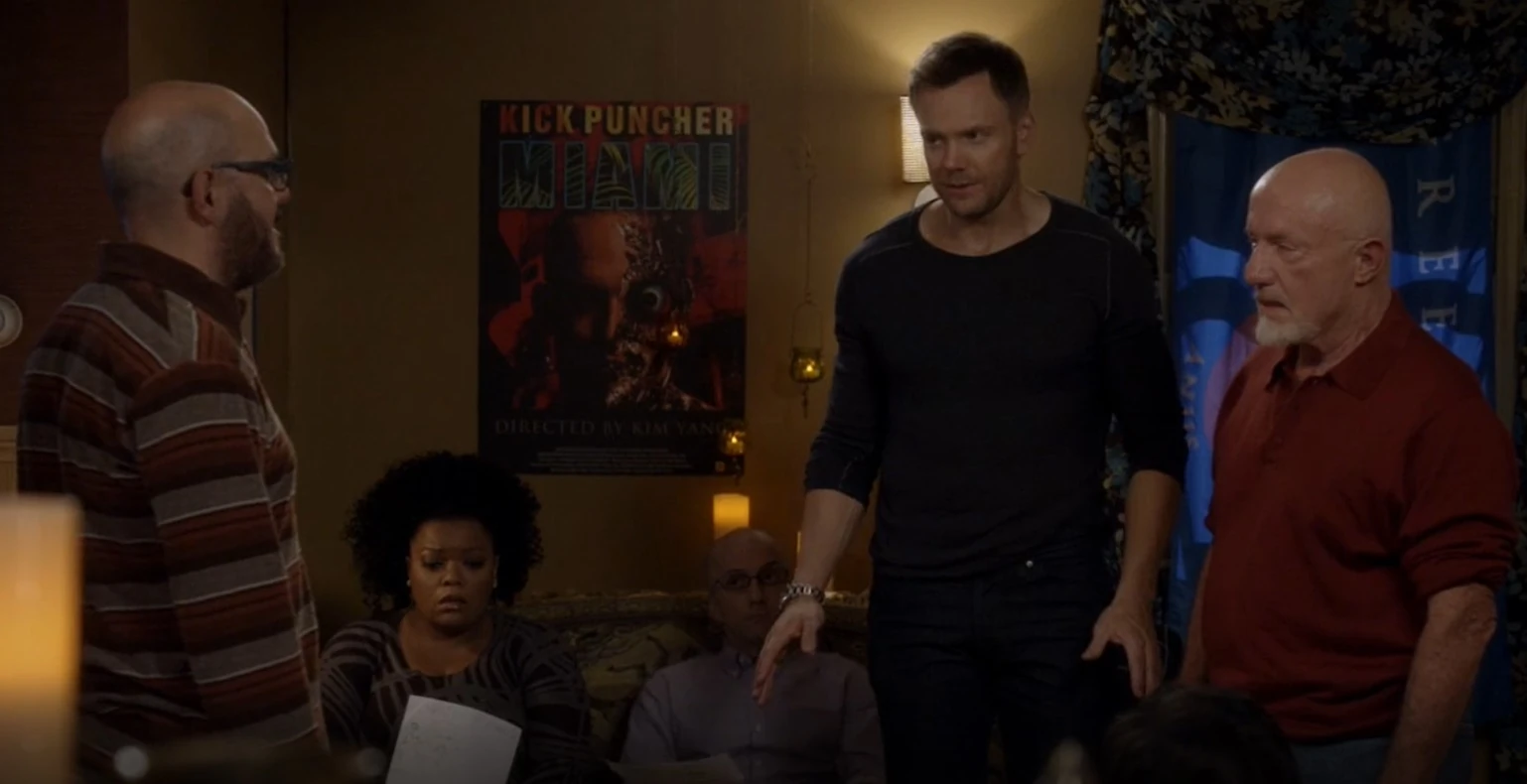 | His fears are proven right when the two groups rendezvous and the other party demands Hank be given the victory. Pelton has his character switch sides but accidentally gets impaled on a sword when he rushes to embrace his "father". Pelton's death causes a bloody battle to erupt between the two parties which leaves Hank and Buzz the only survivors. As the two argue about who gets to kill the "Necromancer" their target escapes. Abed tells them they might still catch him if they work together. Jeff advises that the two should just bury the hatchet and move on but they insist on continuing to play. As the Hickeys begin arguing over strategy, Jeff and the others quietly exit the apartment content that they somewhat succeeded in their quest to reunite father and son.