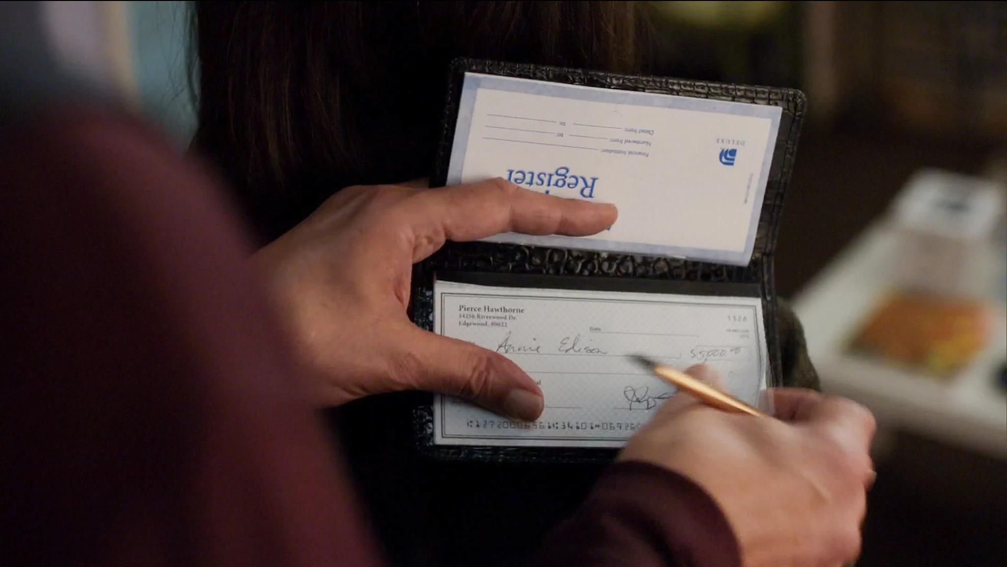 Hawthorne Manor is actually one of six estates owned by his father Cornelius Hawthorne. The large, Gothic style residence was the home of not only Pierce but also his father, Cornelius Hawthorne and his mother. For a time, Troy Barnes lived there as well until he moved into an apartment with Abed. According to the address on Pierce's checkbook, his home is located at 34236 Riverwood Drive, Edgewood 80022. Although mentioned frequently in previous Seasons, the mansion is not physically seen until the Season Four episode "Paranormal Parentage".