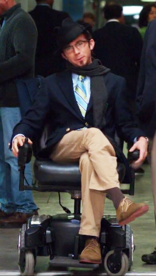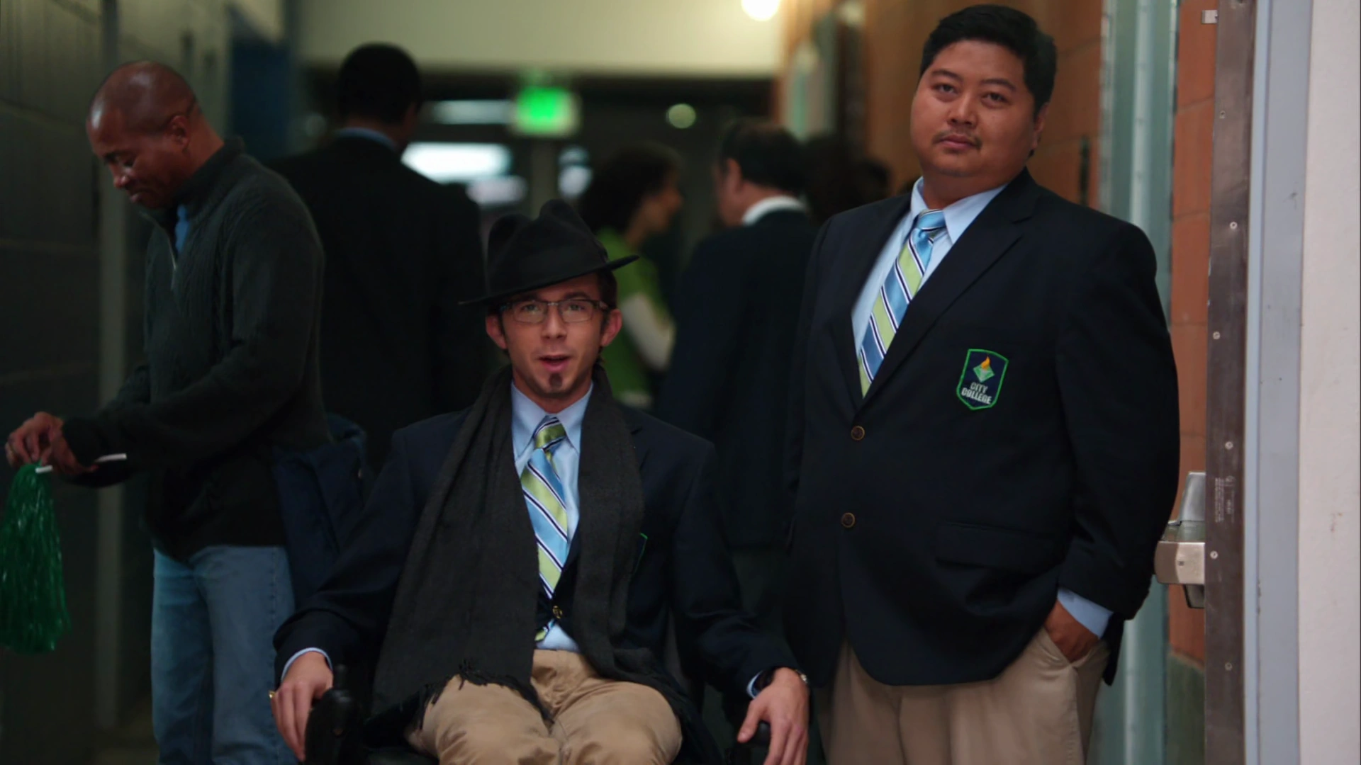 | On the dais, he makes his wheelchair run at full speed towards Jeff. He then makes the chair come to a sudden stop which sends him flying through the air towards the Greendale debate team. Instinctively Jeff catches him and Jeremy then states to the judges that although his opponent hates him but caught him anyway proving that man is good. The judges are impressed by his unorthodox argument as the City College crowd cheers their approval. Annie, however, comes up with a quick rebuttal and pulls Jeff in for a kiss which makes him immediately drop Simmons who does a face plant onto the floor. Breaking the kiss, Annie then declares that Jeff was horny and he dropped Simmons proving that man is evil. The audience and judges are stunned by the argument. The silence is broken when one of the debate judges declares that Greendale won. As the Greendale students in attendance cheers their debate teams victory, Jeremy struggles to deal with his defeat and maintain his composure while stuck in an undignified position ("Debate 109").