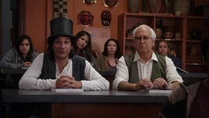 | Instead of a query he surprisingly declared his love for Britta who unexpectedly responded in kind. Bauer expressed her disgust at the cheesy display before taking several sips of her drink. The next day, Bauer reluctantly allowed Jeff to speak to the class again when he volunteered to present the group's assignment. He told everyone that the most important tool was actually respect and without it groups or tribes fall apart. Professor Bauer replied that she had a different opinion. She stated that the most important tool is a weapon made up of all the tools. She pointed an assembled one at Jeff and told him to try and defend himself with respect while she attacked him with the weapon. She fired but missed hitting a window. |