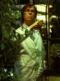 Slightly agitated by their appearance, Bublitz stopped watering his plants and asked if he could help them. Annie told him they wanted to ask him a few questions which elicited a muted response from a scared Bublitz who then quickly ran away. Jeff and Annie pursued him through the dense maze of flora in the lab knocking over various plants and shelving units. They briefly lost sight of Bublitz until Annie spotted him running towards the back. She pushed over a shelf in order to reach him ending the chase. Finally cornered, Bublitz was found to be holding what appeared to be a potted Marijuana plant. He told them that if they were going to confiscate it they should know one thing: "It's a mild, kind sativa, perfect for playing guitar." Although guilty of growing pot in his lab, Bublitz was cleared of being the "Ass Crack Bandit" when Dean Pelton ran into the lab to let Jeff and Annie know the bandit claimed another victim ("Basic Intergluteal Numismatics").