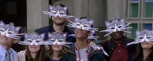 | The Save Greendale Committee and Dean Pelton gather outside to set the remaining bird free. They wear cat masks and finger wings and try to get the bird to leave Greendale and fly into its natural habitat. Once the bird takes off, Britta is quick to compliment Abed on having made a difference on the bird's life. The bird, now out of the Committee's sight, lands into a nearby transformer station and settles into the control box.