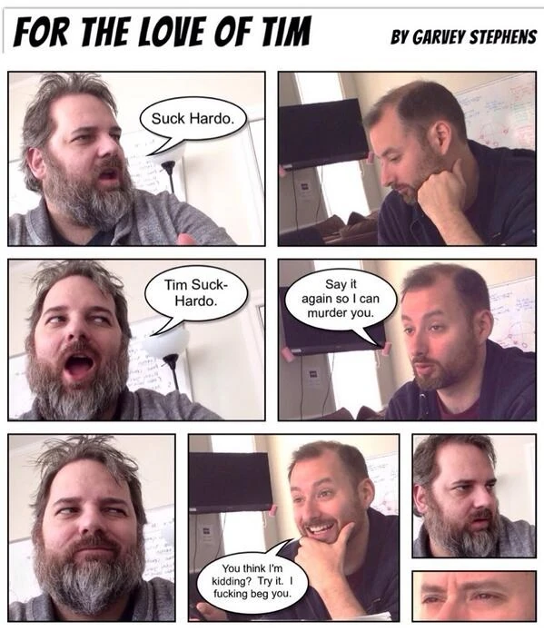 On his twitter account, Tim Saccardo posted these cartoons by a Garvey Stephens featuring him and Community creator Dan Harmon.